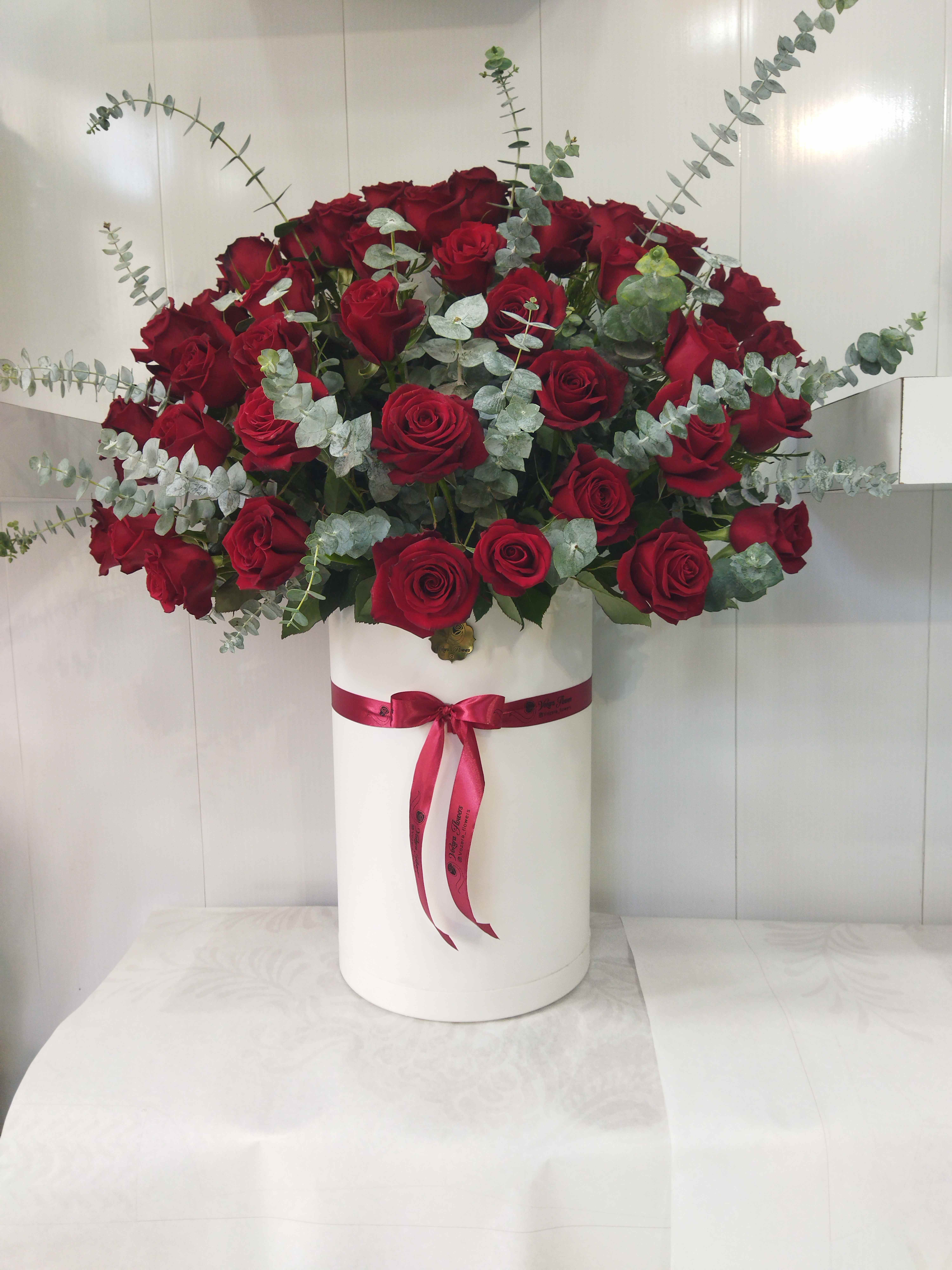 باکس گل ۴۱ شاخه ای رز هلندی دیزاین شده در فروشگاه گل و گیاه وزرا که همراه با برگ اکالیپتوس داخل باکس استوانه ای لاکچری هدیه ای وزین و زیبا برای عزیزانتون خواهد بود.